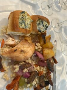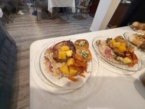 August 2025 Odd White Wines: Hawaiian Chicken with Onions/Peppers/Pineapple, Cous Cous, Rolls w/ Spinach Artichoke Dip & Key Lime Pie